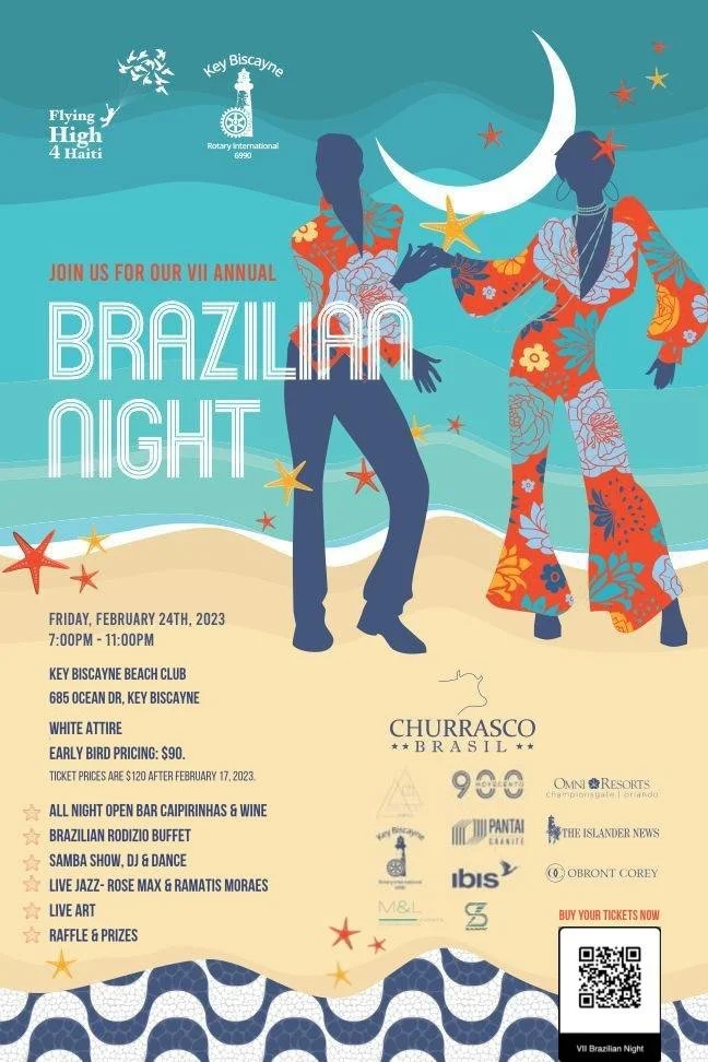 The Rotary Club of Key Biscayne and Flying High 4 Haiti invite you to the IX annual Brazilian Night! Join us for an unforgettable evening in support of a great cause-helping support a school in Haiti. This year, we are exited to showcase Haitian music and folklore, adding a vibrant cultural touch to the event. Enjoy an open bar featuring caipirinhas and wine, indulge in delicious Brazilian rodizio, dance the beat of our DJ and much more.
